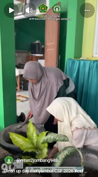 Kegiatan bersih-bersih di lingkungan MTsN 2 Jombang menjadi wujud nyata kepedulian seluruh warga sekolah terhadap kebersihan dan kenyamanan bersama, di mana siswa dan guru bergotong royong membersihkan area sekolah sambil menanamkan nilai tanggung jawab, disiplin, dan cinta lingkungan, karena dari lingkungan yang bersih akan tercipta suasana belajar yang sehat, nyaman, dan penuh semangat 🌿✨