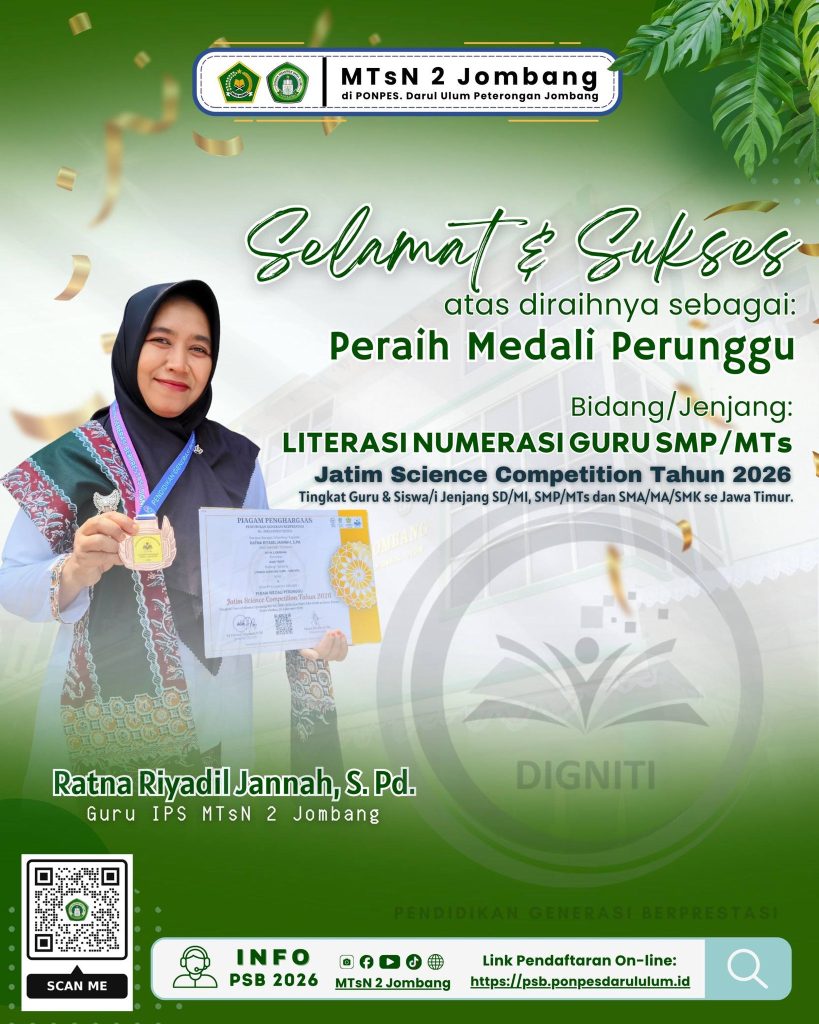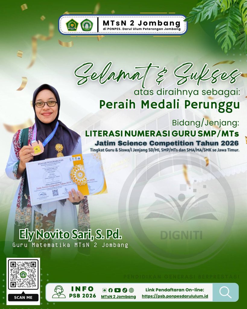 MTsN 2 Jombang terus mendorong peningkatan kualitas pendidikan melalui penguatan sumber daya manusia berprestasi, salah satunya melalui sosok Ratna riyadil Jannah, S.Pd dan Ely Novito Sari, S.Pd. guru MTsN 2 Jombang Mapel IPA dan MATEMATIKA, yang berhasil meraih penghargaan tingkat Se Jawa Timur Tahun 2026. Semoga bisa menjadi inspirasi bagi guru yang lainnya