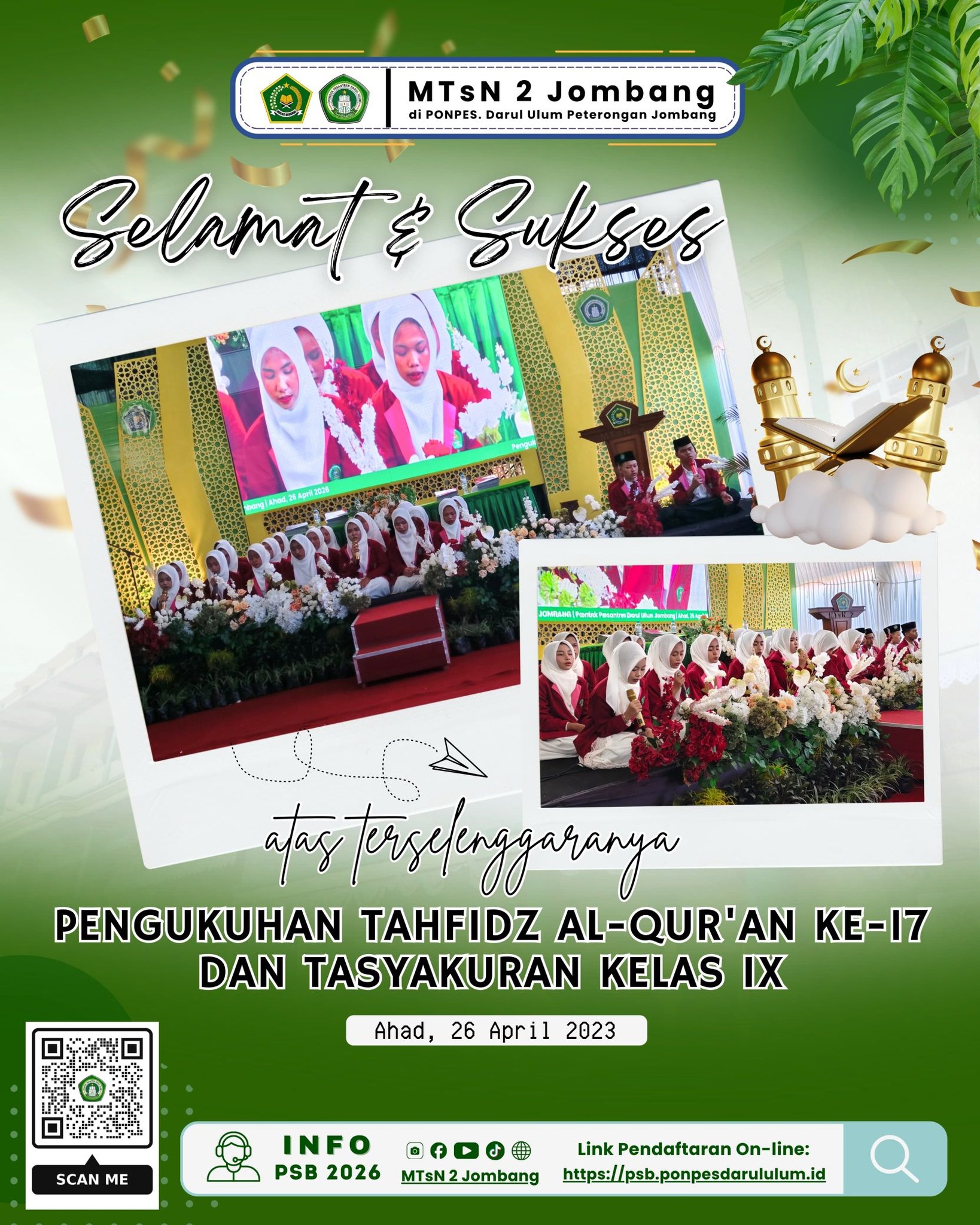 Hari ini menjadi saksi perjalanan panjang para penghafal Al-Qur’an di Pengukuhan Tahfidz ke-17 & Tasyakuran Kelas IX MTsN 2 Jombang. Bertempat di lingkungan penuh barokah, Pondok Pesantren Darul Ulum Peterongan Jombang